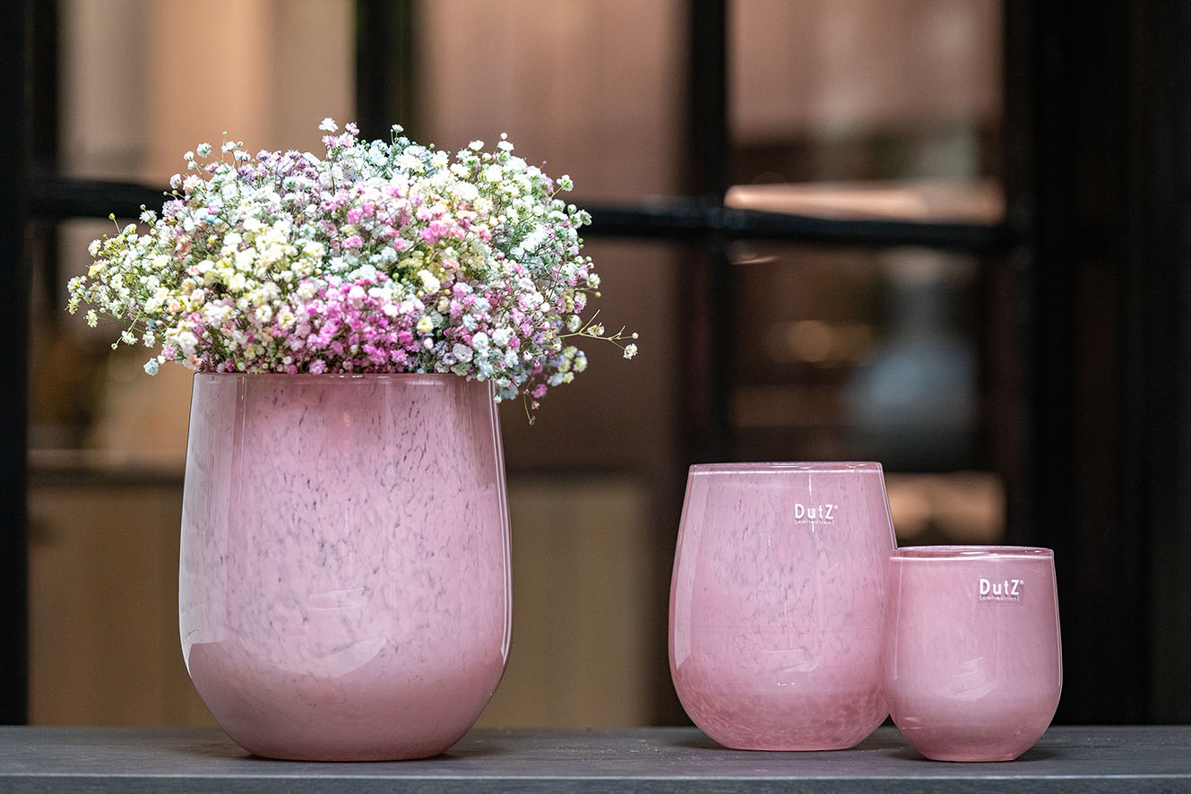 BARREL/VASE ROSEThe mouth blown vases and pots of DutZ collection are of high quality and not only suitable for flowers or candles but also very decorative with plants. The pots are available in several sizes so there is always a suitable size for the windowsill, sidetable, kitchen table, living room table, coffee table, bathroom, bedroom and kitchen.DutZ collection has many glass flower pots and vases in the collection in many colours. This model is a classic in the collection and perfect with a bunch of tulips, field bouquet, orchid or succulents.The round open shape makes the glass pot also suitable to use as a glass windlight during warm and cosy evenings. An eye-catcher in every interior.The colour of this barrel/vase is rose.- Mouth blown- Thick glass- Blown in Europe- Available in three sizesEvery DutZ barrel/vase is unique! Every glass vase is mouth blown by glassblowers from our European glass factories. Each product can therefore differ slightly in colour and shape from the images. Small deviations such as bubbles and scratches are not defects but a result of the traditional process of traditional glass blowing. They enrich the product and give it a unique appearance.DutZ= Dare to be distinct!