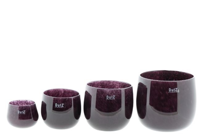 POT PLUMThe mouth blown vases and pots of DutZ collection are of high quality and not only suitable for flowers or candles but also very decorative with plants. The pots are available in several sizes so there is always a suitable size for the windowsill, sidetable, kitchen table, living room table, coffee table, bathroom, bedroom and kitchen.DutZ collection has many glass flower pots in the collection in many colours. This model is a classic in the collection and perfect with an orchid, cactus or succulents.The round open shape makes the glass pot also suitable to use as a glass hurricane during warm and cosy evenings. An eye-catcher in every interior.The colour of this pot is plum.- Mouth blown- Thick glass- Blown in Europe- Available in four sizesEvery DutZ pot is unique! Every glass jar is mouth blown by glassblowers from our European glass factories. Each product can therefore differ slightly in colour and shape from the images. Small deviations such as bubbles and scratches are not defects but a result of the traditional process of traditional glass blowing. They enrich the product and give it a unique appearance.DutZ= Dare to be distinct!
