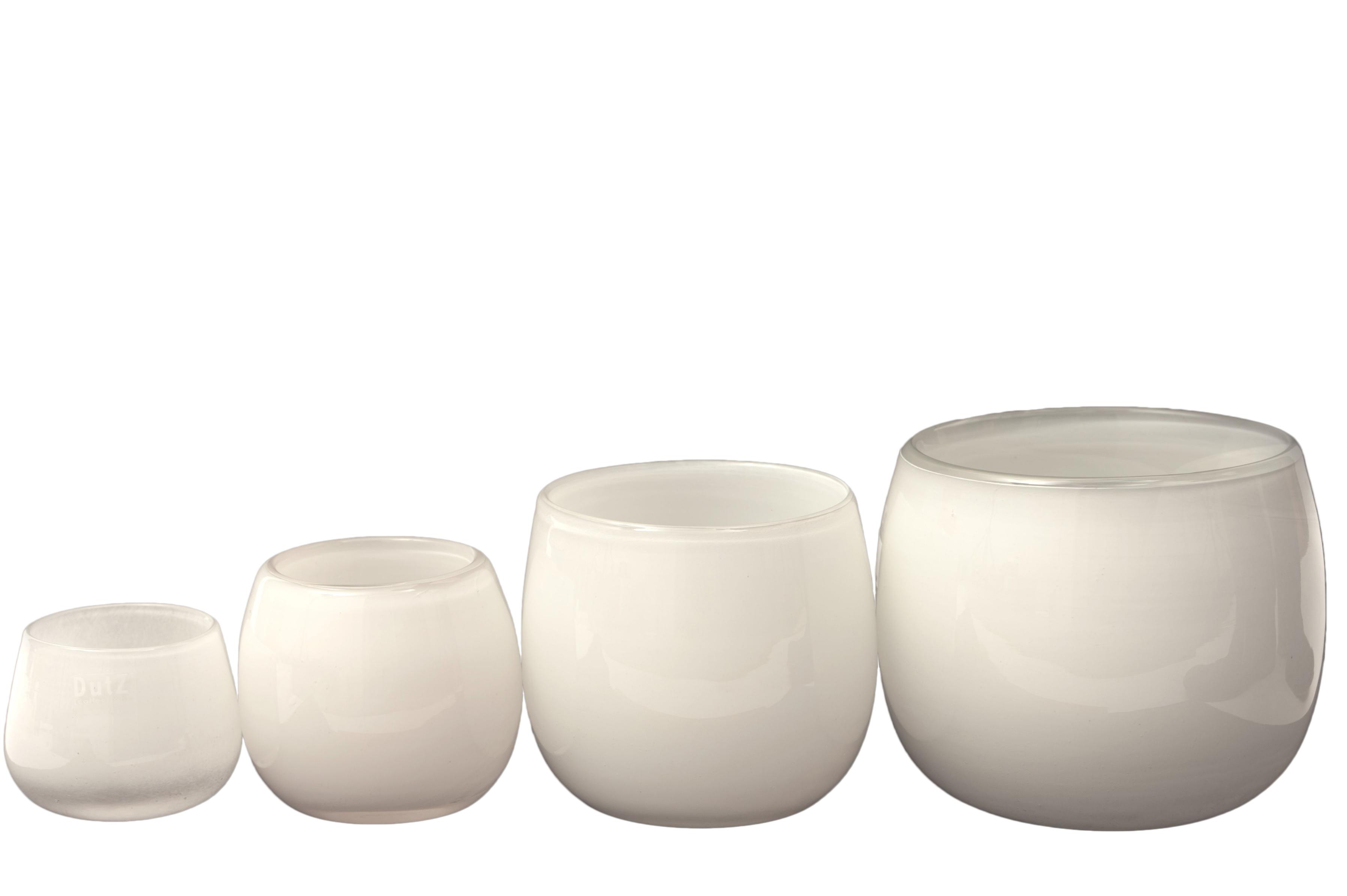 POT WHITEThe mouth blown vases and pots of DutZ collection are of high quality and not only suitable for flowers or candles but also very decorative with plants. The pots are available in several sizes so there is always a suitable size for the windowsill, sidetable, kitchen table, living room table, coffee table, bathroom, bedroom and kitchen.DutZ collection has many glass flower pots in the collection in many colours. This model is a classic in the collection and perfect with an orchid, cactus or succulents.The round open shape makes the glass pot also suitable to use as a glass hurricane during warm and cosy evenings. An eye-catcher in every interior.The colour of this pot is white.- Mouth blown- Thick glass- Blown in Europe- Available in five sizesEvery DutZ pot is unique! Every glass jar is mouth blown by glassblowers from our European glass factories. Each product can therefore differ slightly in colour and shape from the images. Small deviations such as bubbles and scratches are not defects but a result of the traditional process of traditional glass blowing. They enrich the product and give it a unique appearance.DutZ= Dare to be distinct!