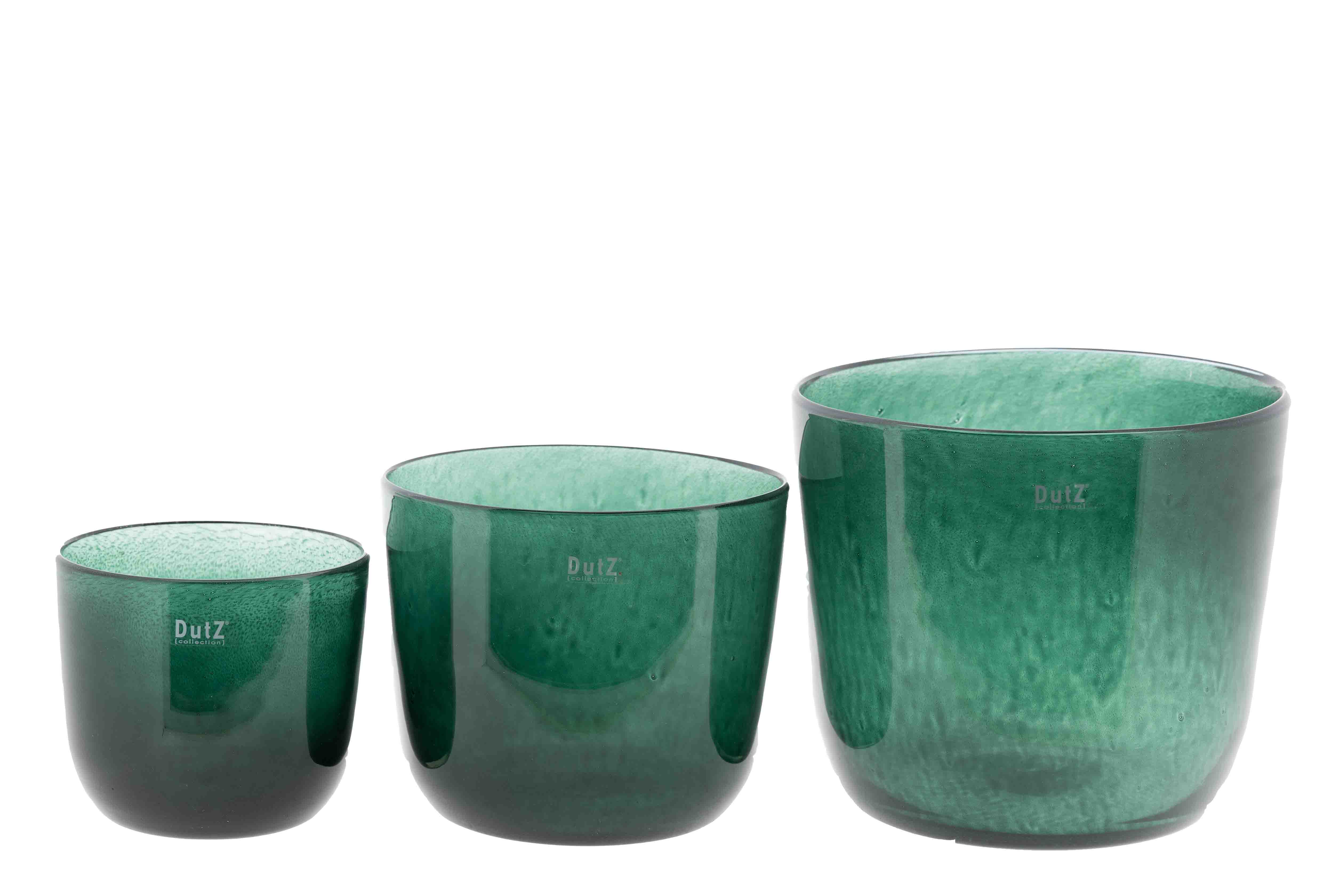 POT WIDE DARKGREENThe mouth blown vases and pots of DutZ collection are of high quality and not only suitable for flowers or candles but also very decorative with plants. The pots are available in several sizes so there is always a suitable size for the windowsill, sidetable, kitchen table, living room table, coffee table, bathroom, bedroom and kitchen.DutZ collection has many glass flower pots in the collection in many colours. This model is a classic in the collection and perfect with an orchid, cactus or succulents.The round open shape makes the glass pot also suitable to use as a glass hurricane during warm and cosy evenings. An eye-catcher in every interior.The colour of this pot is darkgreen.- Mouth blown- Thick glass- Blown in Europe- Available in three sizesEvery DutZ pot is unique! Every glass jar is mouth blown by glassblowers from our European glass factories. Each product can therefore differ slightly in colour and shape from the images. Small deviations such as bubbles and scratches are not defects but a result of the traditional process of traditional glass blowing. They enrich the product and give it a unique appearance.DutZ= Dare to be distinct!