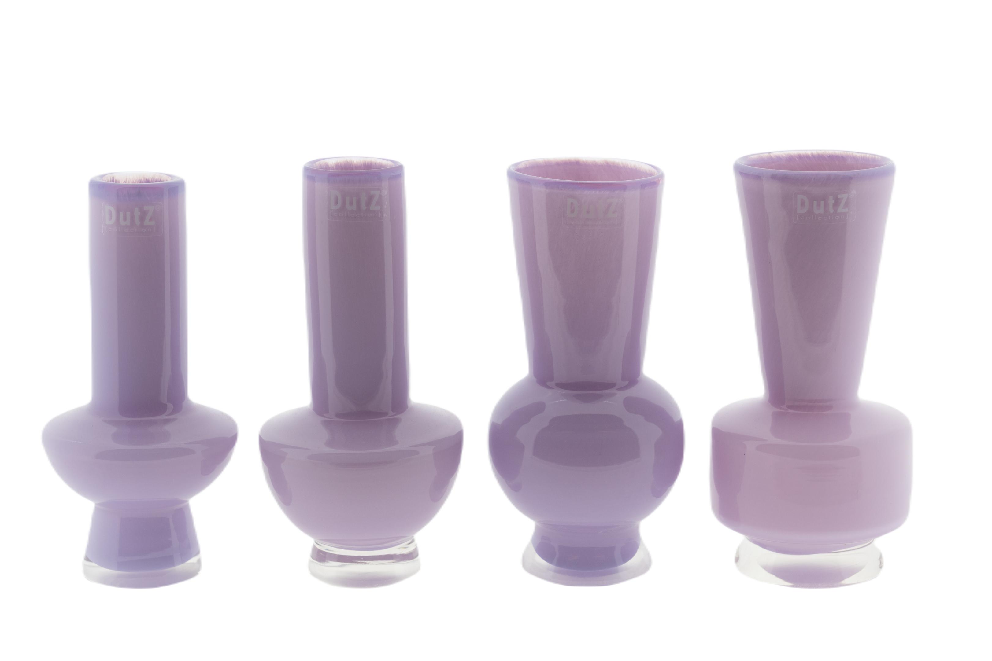 SET VIBE LILAThis vase set consists of 4 vases (4 models, 1 pieces each) in a certain colour. With this set of vases, you can easily create a beautiful combination of vases. Put them together on a plate, or separately on a table, side table, in the bathroom or bedroom.The mouth blown vases of DutZ collection are of high quality and perfect for single flowers.DutZ collection has many glass vases and windlights in the collection in many colours. This vase set is a topper in the collection and ensures years of pleasure. The colours of this vase set are lila.- Mouthblown- Thick glass- Blown in EuropeEach DutZ vase is a unique piece! Each article is mouth-blown by glassblowers from our European glassworks. Each product may therefore differ slightly in colour and shape from the pictures. Small deviations such as bubbles and scratches are not defects but a consequence of the traditional glassblowing process. They enrich the product and give it a unique appearance.DutZ= Dare to be distinct!