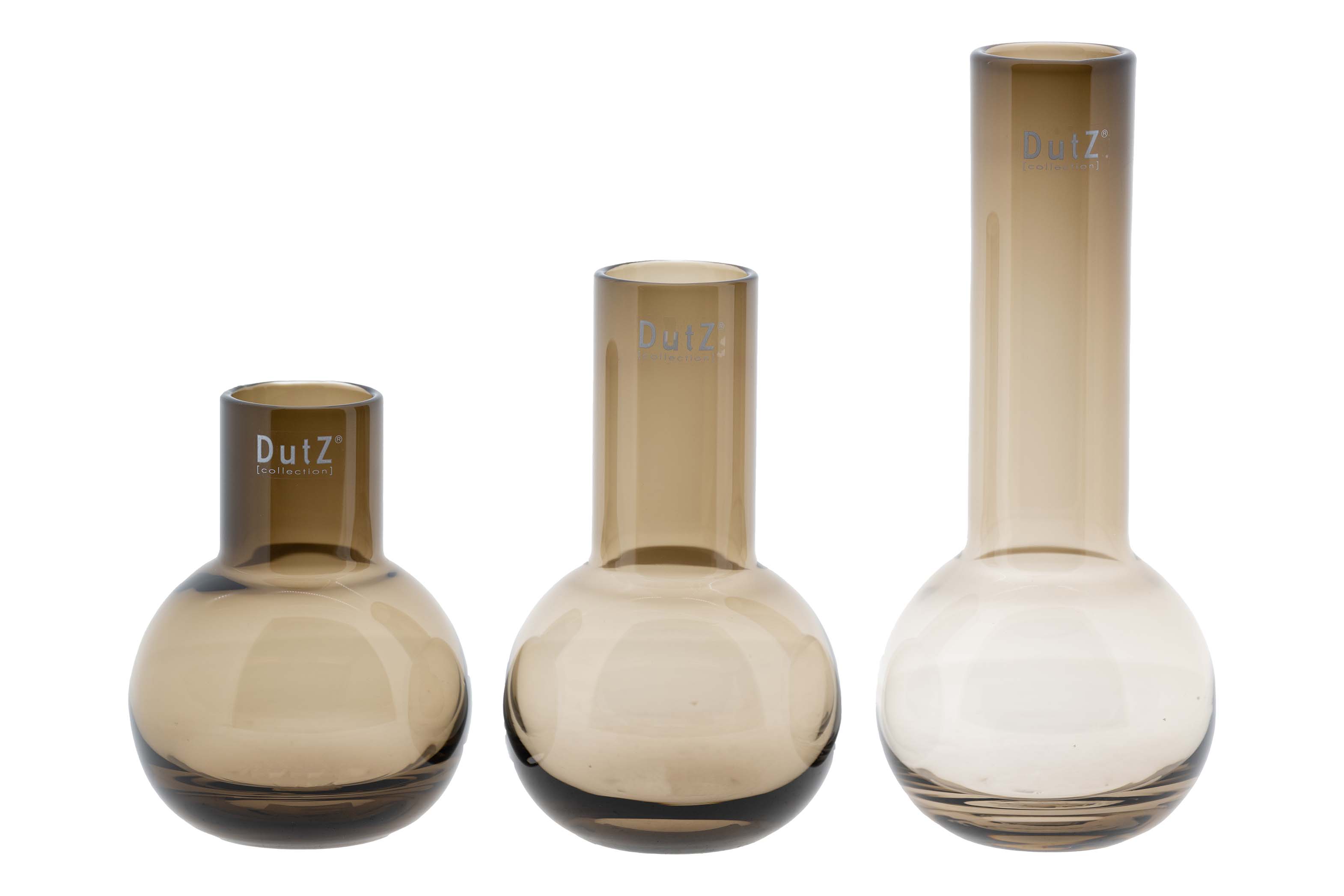 VASE MASA SMOKY BROWNThe mouth blown vases and pots of DutZ collection are of high quality and not only suitable for flowers or candles but also very decorative with plants. The vases are available in several sizes so there is always a suitable size for the windowsill, sidetable, kitchen table, living room table, coffee table, bathroom, bedroom and kitchen.DutZ collection has many glass flower pots in the collection in many colours. This model is a classic in the collection and perfect with an orchid, cactus or succulents.The round open shape makes the glass pot also suitable to use as a glass hurricane during warm and cosy evenings. An eye-catcher in every interior.The colour of this vase is smoky brown.- Mouth blown- Thick glass- Blown in Europe- Available in three sizesEvery DutZ pot is unique! Every glass jar is mouth blown by glassblowers from our European glass factories. Each product can therefore differ slightly in colour and shape from the images. Small deviations such as bubbles and scratches are not defects but a result of the traditional process of traditional glass blowing. They enrich the product and give it a unique appearance.DutZ= Dare to be distinct!