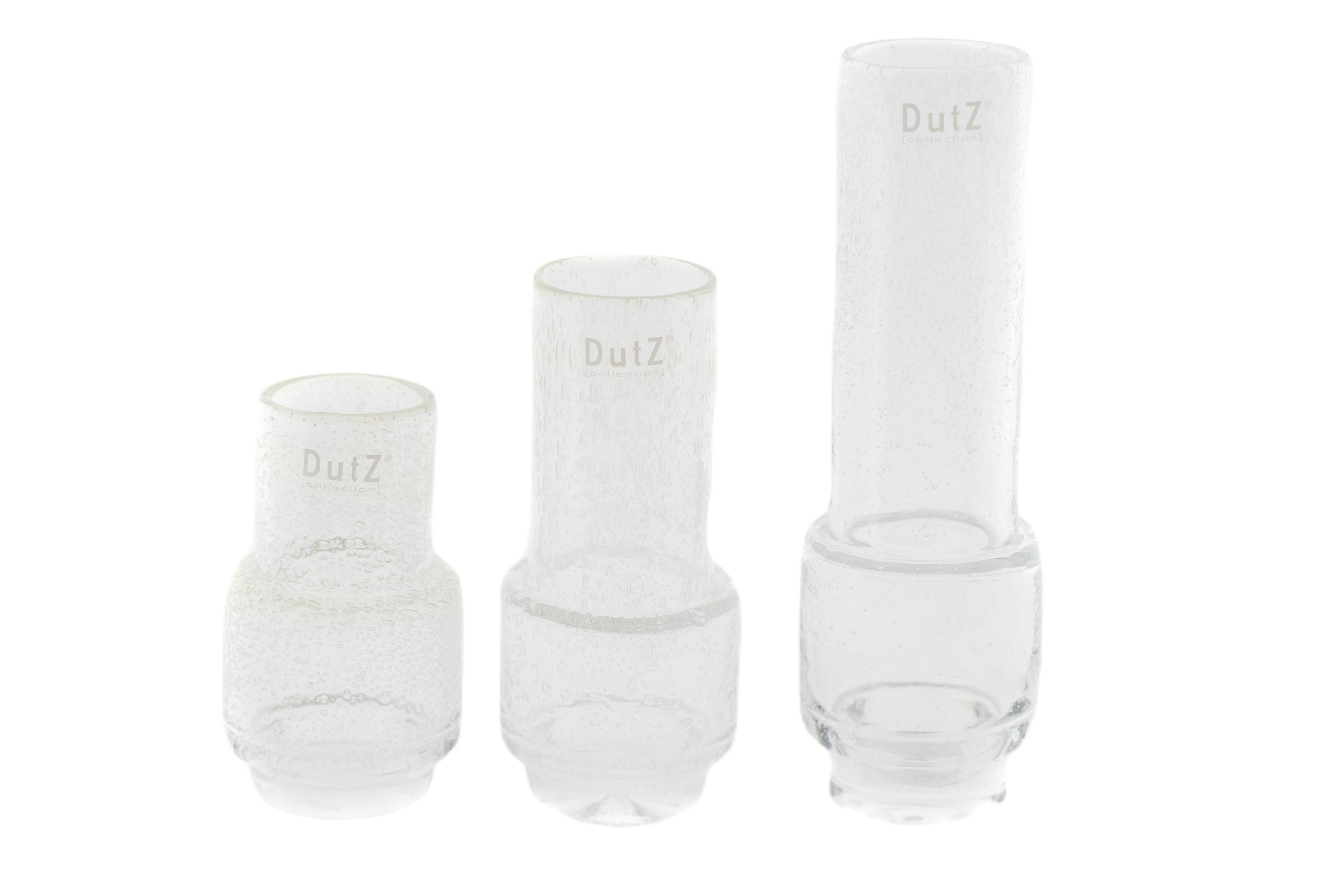 VASE RONA CLEAR BUBBLESThe mouth blown vases and pots of DutZ collection are of high quality and not only suitable for flowers or candles but also very decorative with plants. The vases are available in several sizes so there is always a suitable size for the windowsill, sidetable, kitchen table, living room table, coffee table, bathroom, bedroom and kitchen.DutZ collection has many glass flower pots in the collection in many colours. This model is a classic in the collection and perfect with an orchid, cactus or succulents.The round open shape makes the glass pot also suitable to use as a glass hurricane during warm and cosy evenings. An eye-catcher in every interior.The colour of this vase is clear bubbles.- Mouth blown- Thick glass- Blown in Europe- Available in three sizesEvery DutZ pot is unique! Every glass jar is mouth blown by glassblowers from our European glass factories. Each product can therefore differ slightly in colour and shape from the images. Small deviations such as bubbles and scratches are not defects but a result of the traditional process of traditional glass blowing. They enrich the product and give it a unique appearance.DutZ= Dare to be distinct!