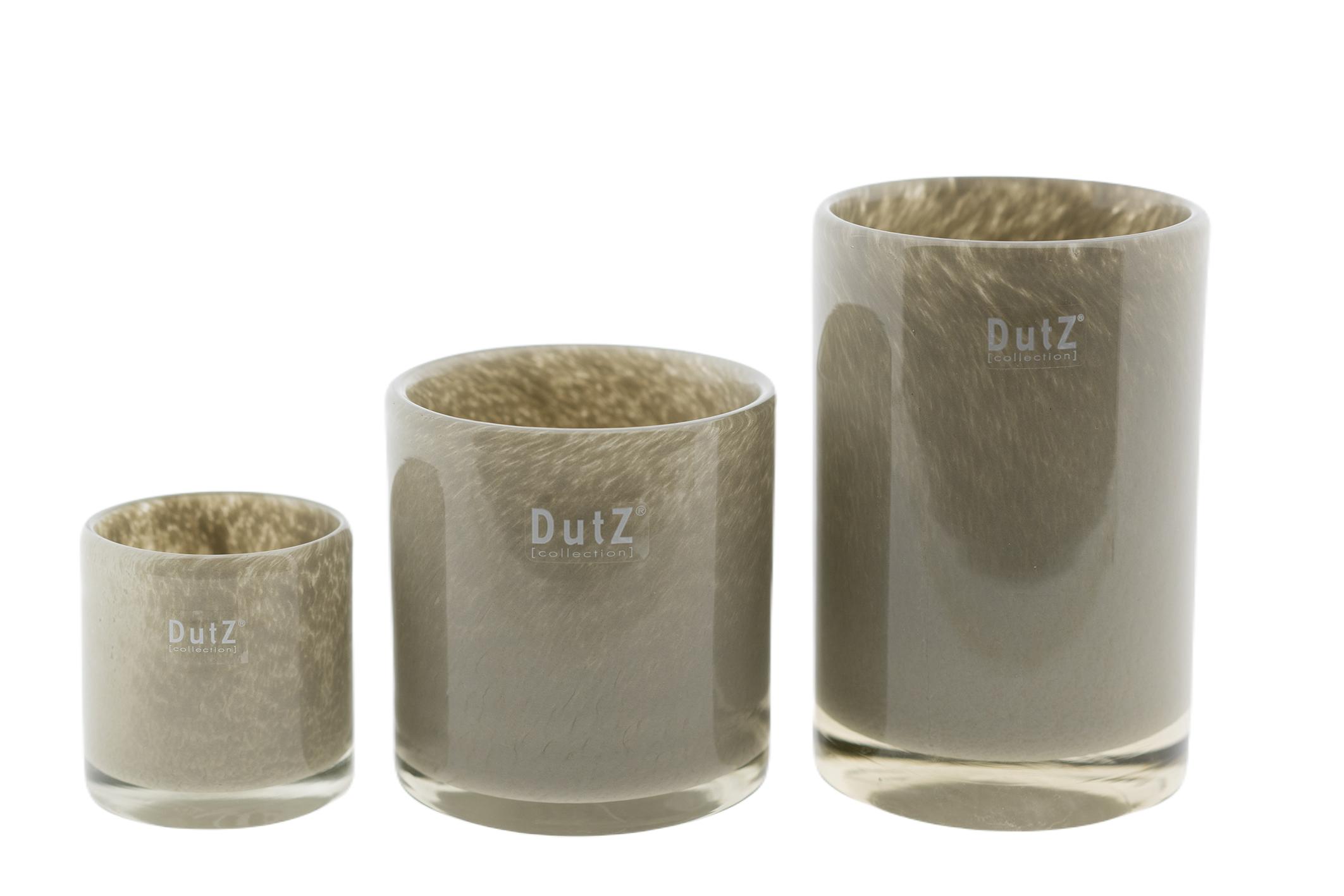 CYLINDERVASE/HURRICANE TAUPEThe mouthblown vases and hurricanes of DutZ collection are of high quality and perfect for candles, a rich bouquet or some beautiful flowers (with thick stems). The smaller sizes are perfect as glass tea light holders.The glass hurricane lamps and vases are available in multiple sizes so there is always a suitable size for the windowsill, side table, kitchen table, living room table, coffee table, bathroom, bedroom and kitchen.DutZ collection has many glass vases and hurricanes in the collection in many different colours. This model is a real winner in the collection and perfect with thick candles for many cozy evenings. You should also take a look at our luxury candle collection.This glass hurricane light is timeless and will give you years of pleasure. An indispensable product for any interior.The colour of this vase/hurricane is taupe.- Mouthblown- Thick glass- Blown in Europe- Available in three sizesEach DutZ hurricane and tea-light holder is a unique piece! Each article is mouth-blown by glassblowers from our European glassworks. Each product may therefore differ slightly in colour and shape from the pictures. Small deviations such as bubbles and scratches are not defects but a consequence of the traditional glassblowing process. They enrich the product and give it a unique appearance.DutZ= Dare to be distinct!